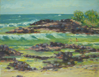 Two more beach paintings in my more colorful style lately. Top one is old airport beach, the north end. Lots of rocks and a few swimmers braving the waves.