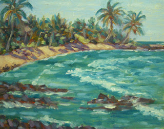 This 8x10 is from the beach just south of Manini Beach, facing south. Nice surf and a sunny morning. I did some "color bombs" in the foliage with lots of small brush strokes. Might need a tiny touchup before completely done.